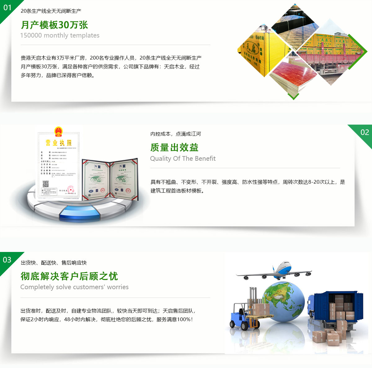 貴港市天啟木業(yè)位廣西貴港市覃塘區(qū),是中國建筑模行業(yè)規(guī)模十大的企業(yè)之一,有著優(yōu)越地理位置,臨廣東,貴州,湖南,云南、交通運輸區(qū)位十分優(yōu)勢。現(xiàn)有職工近300人,占地50余畝,其中建筑面積近3萬平方米。日產(chǎn)量2萬張,年產(chǎn)量500萬余張;公司正在逐步壯大,旗下有4家分公司,總年產(chǎn)量近1500萬張!天啟木業(yè)引進芬蘭制膠技術(shù),采用先進生產(chǎn)工藝。公司生產(chǎn)的建筑膜板采用優(yōu)質(zhì)的防水膠制作,循環(huán)使用次數(shù)多,品質(zhì)在同行業(yè)內(nèi)認(rèn)可度極高。是一家集產(chǎn)品研發(fā),生產(chǎn),銷售,服務(wù)于一體的綜合型大型民營企業(yè)。產(chǎn)品覆蓋全國20多個省,市,自治區(qū)。
